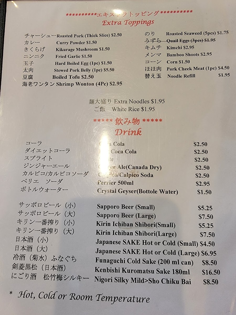 Choice of Soup Flavor and Spicy Level !! Soup Flavor> 1)Soy Brown Sauce, 2)Pork Tonkotsu, 3)Garlic Pork Tonkotsu, 4) Miso, 5)Tokyo style, 6) Yokohama Style, Spice Level> Non Spicy, Mild, Medium, Extra Spicy.
