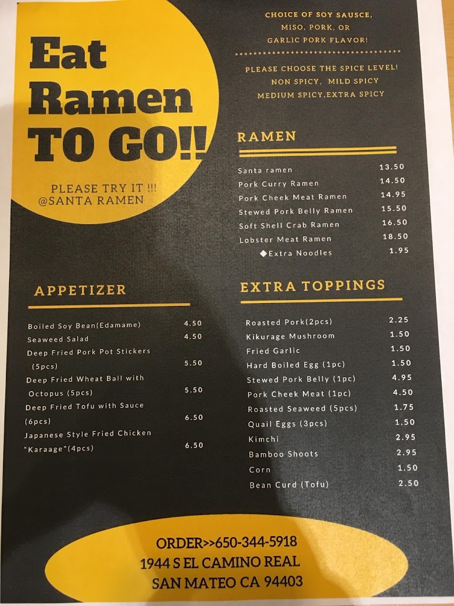 Welcome to Santa Ramen, a celebrated ramen destination nestled in San Mateo, CA. This restaurant boasts a delightful array of Japanese noodle soups, meticulously crafted with a choice of flavors and spice levels. Diners can indulge in rich offerings like Pork Tonkotsu, Garlic Pork Tonkotsu, and Miso, catering to varying palates with spice levels ranging from Non Spicy to Extra Spicy.
